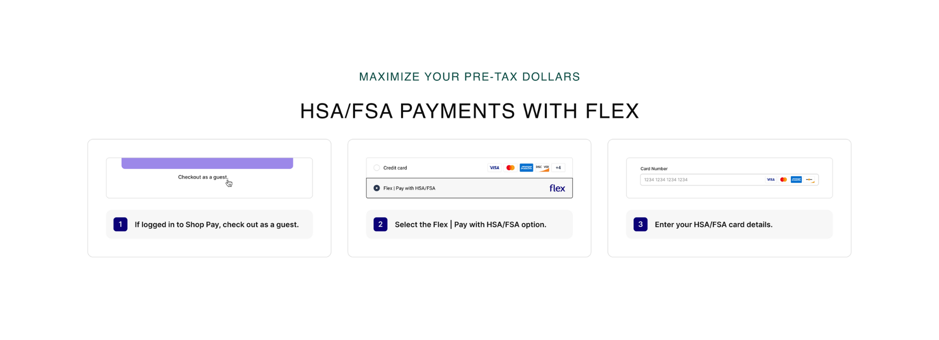 To use your HSA or FSA debit card, add products to your cart as usual. At checkout, select “Flex | Pay with HSA/FSA” as your payment option, enter your HSA or FSA debit card, and complete your checkout as usual. If you don’t see “Flex | Pay with HSA/FSA,” you may be in Shop Pay. Select “checkout as guest” to view more payment options.